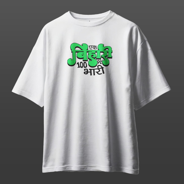 Show off your roots with pride. Our collection celebrates the strength and spirit of Bihar. Made from 100% cotton for ultimate comfort and quality, this unisex oversized tee features the iconic ‘एक बिहारी 100 पे भारी’ slogan. It’s more than just a shirt; it’s a statement of identity and resilience.